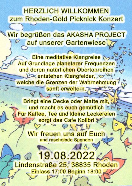Cosmic Picknick in RhodenEin besonderer Augenblick in Zeit und Raum Einlass 17:00 Beginn 20:00 Lindenstr.25, 38835 Rhoden | |